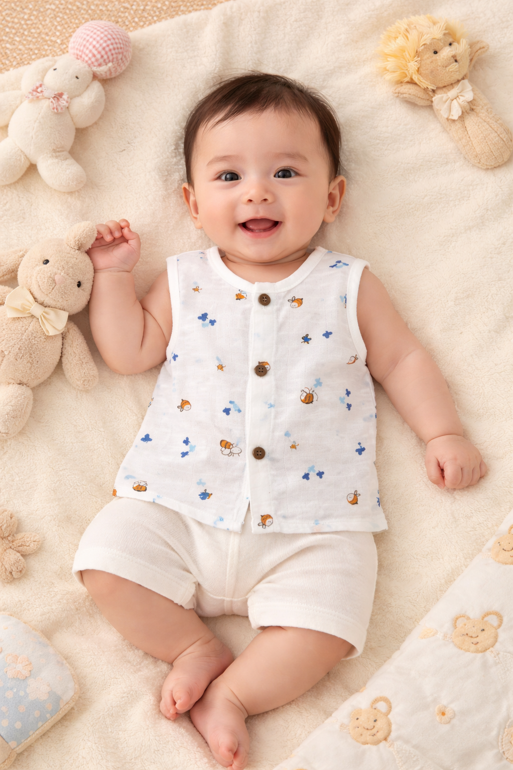 Designed with adorable animal prints, this vest adds a fun and cheerful look while remaining soft on delicate newborn skin. The front wooden-style button closure allows easy dressing and quick changes. Perfect as innerwear, summer wear, or layering under baby outfits, this vest combines comfort, style, and practicality.