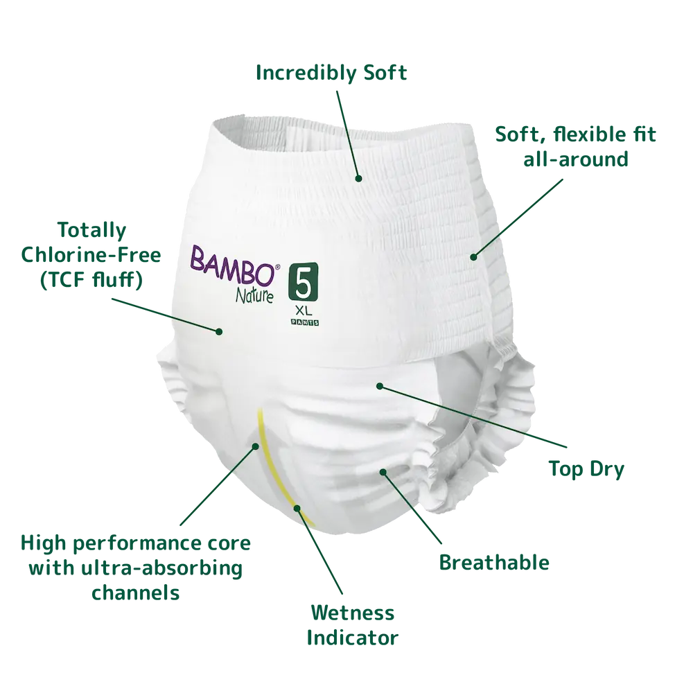 The Bambo Nature Pants have a soft, flexible fit all-around, are comfortable, and keep even the most sensitive skin dry. Easy for little hands to pull up and down and ideal for potty training. Designed with a super-absorbent core, including the latest channel technology, that leads moisture away from the child’s skin quickly and holds up to multiple wettings.