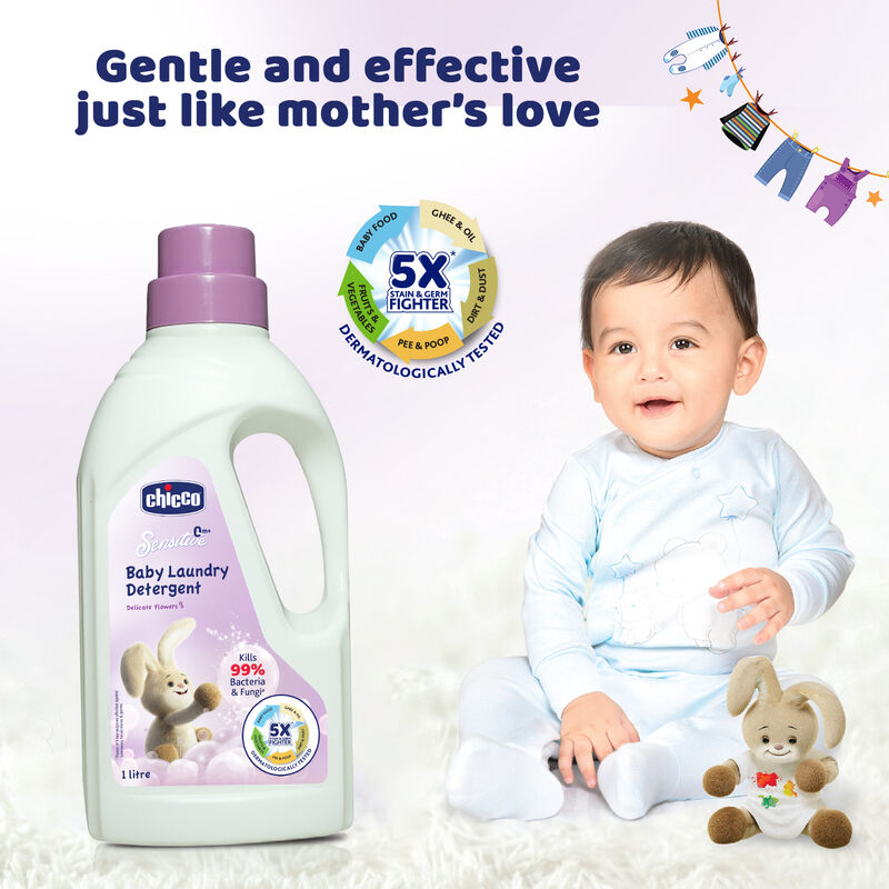 Chicco Baby Laundry Detergent has been specially formulated to effectively clean baby’s clothes by removing tough stains & odour, leaving clothes delicately fragrant. It has a unique combination of 5 key enzymes that are effective against almost all types of stains and germs that a baby’s clothes are prone to get, such as baby food, ghee-oil, fruits-vegetables, pee-poop, and dirt-dust. With anti-bacterial and anti-fungal properties, Chicco baby laundry detergent gives your little one’s clothes a thorough and hygienic wash by killing 99% of commonly found bacteria and fungi. It is Dermatologically tested on sensitive skin and is free from phosphorous, fluorescence, brighteners & colorants, thus keeps the clothes gentle and delicate on baby’s skin, thereby, causing no irritation or discomfort. Comes with a measuring cap that helps to easily measure the right amount of detergent required for washing clothes. Suitable for both hand wash and machine wash, Chicco Baby Laundry Detergent is available in two amazing variants that will keep the clothes delicately fragrant.