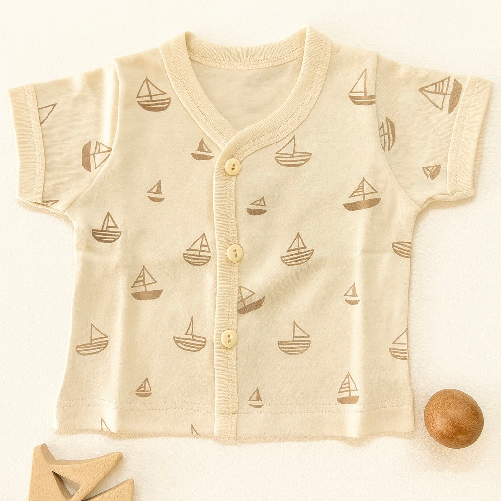 Soft cotton baby jabla with cute boat prints, designed for comfort and style.