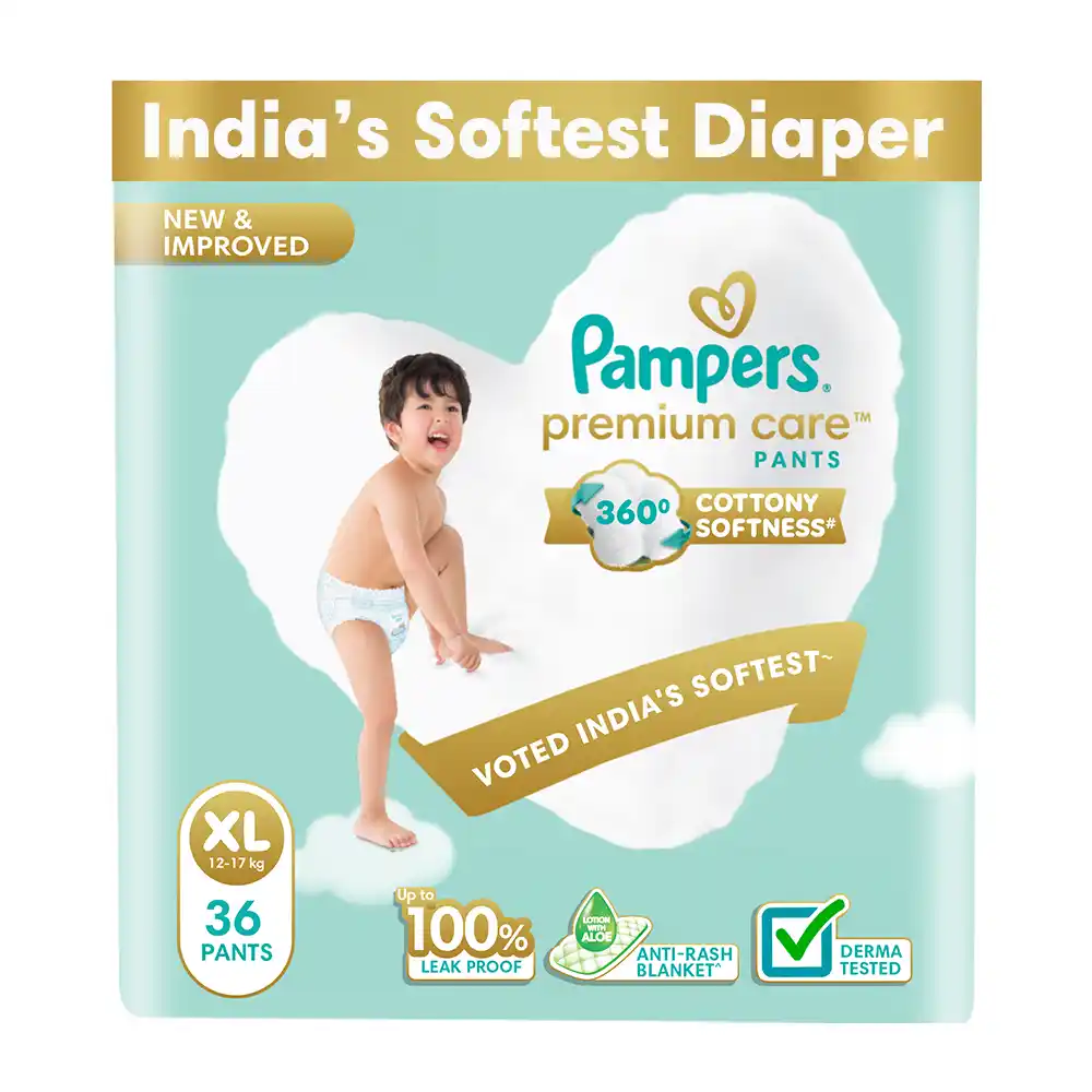New Pampers Premium Care Pants with 360 degree cottony softness gives your baby the ultimate comfort all day, all night long. Pampers Premium Care Pants contain soothing lotion with Aloe Vera to protect your baby’s skin from rashes, while its 10 million micropores allow your baby’s skin to breathe. Its 12-hour leak lock facility keeps your baby dry and away from wetness. Experience 5-Star comfort with unique added features like Wetness Indicator which turns Yellow to Blue indicating when you may change the diaper and a Disposal Tape to help you with easy disposal. Pampers Premium Pants are available in New-born (NB), S, M, L, XL and XXL sizes.