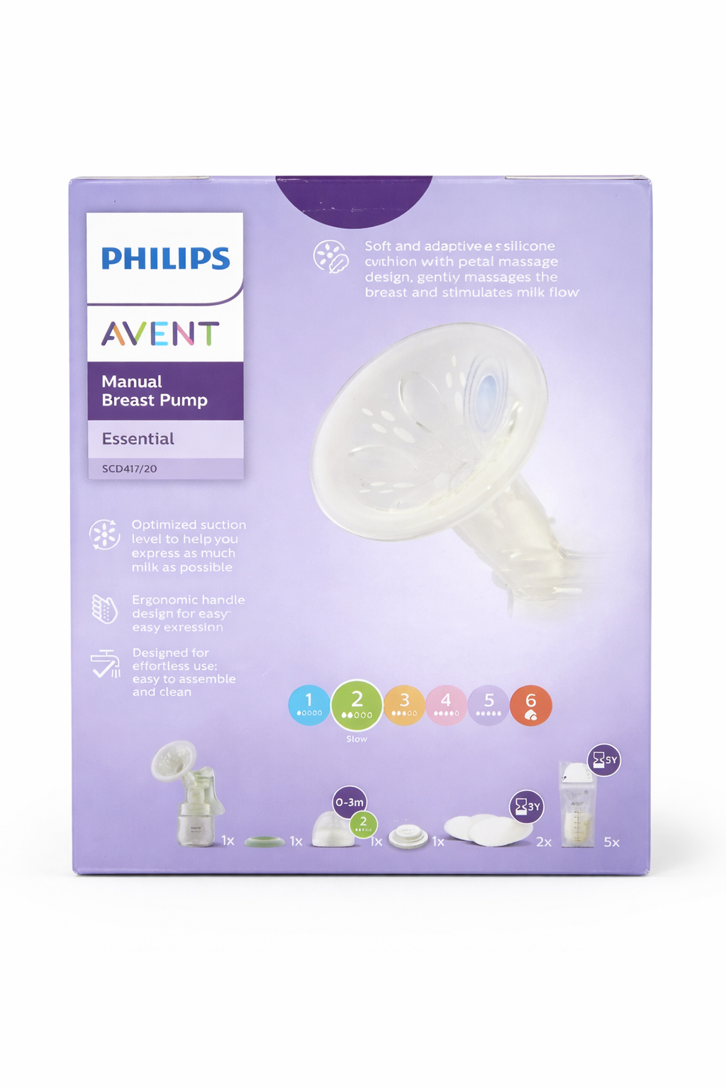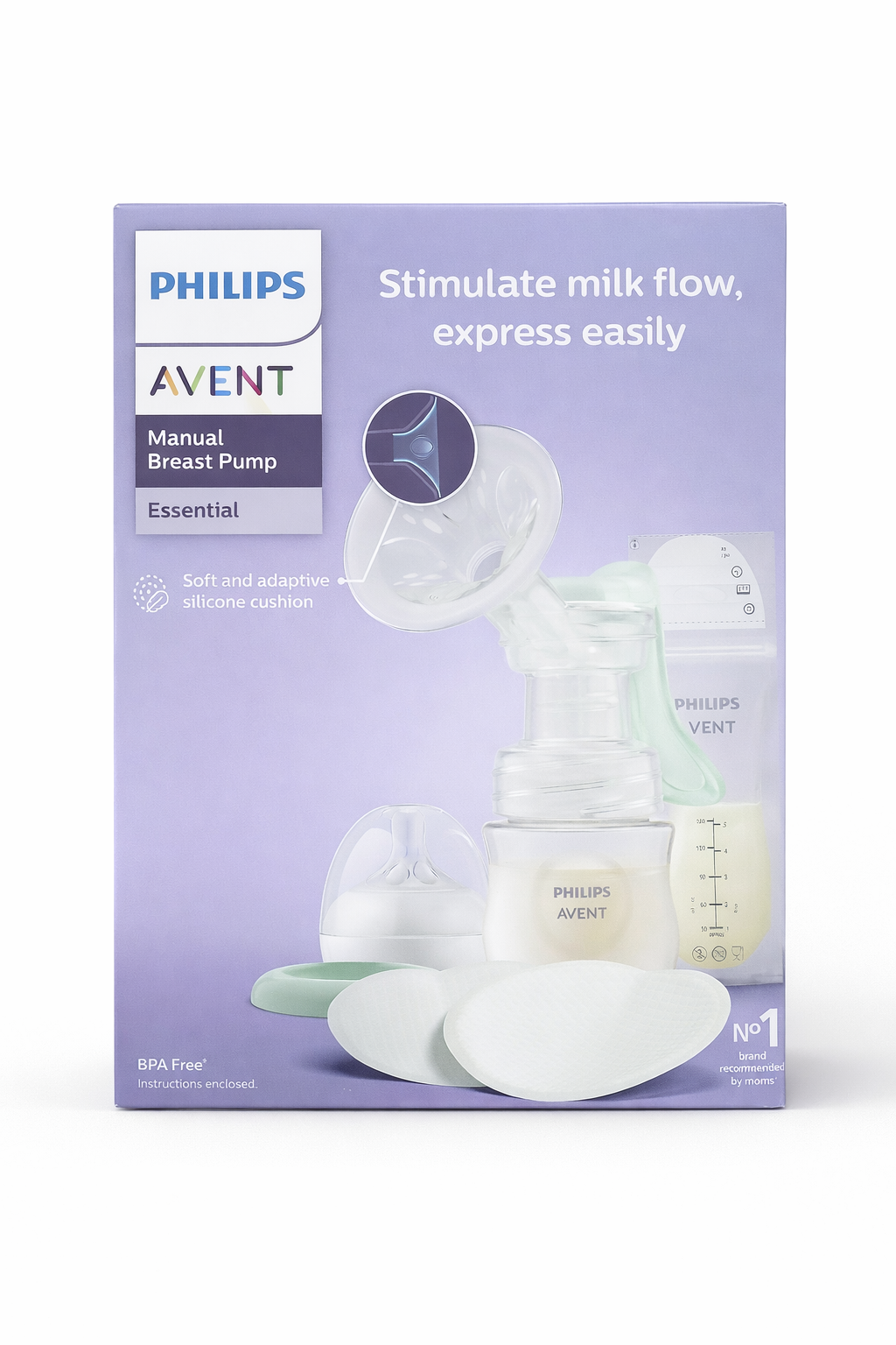 The Philips Avent Manual Breast Pump – Essential is designed to help mothers express milk comfortably and naturally. Its soft and adaptive silicone cushion gently massages the breast to stimulate milk flow, making expression easier and more efficient. The ergonomic handle allows smooth, effortless pumping, while the compact design makes it ideal for home or travel use. Easy to assemble, clean, and BPA-free, it ensures safety and convenience for everyday use.