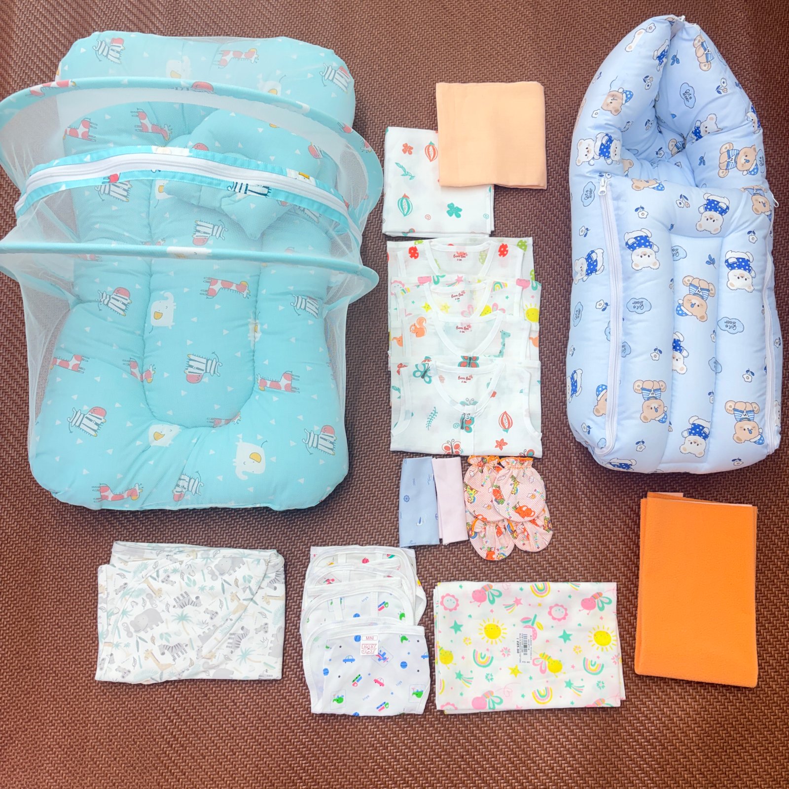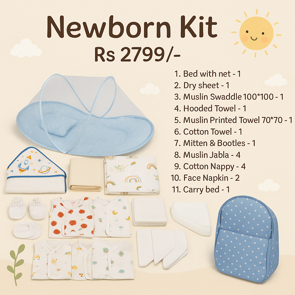 A complete 11-piece newborn kit crafted from soft muslin and cotton for your baby’s first days. Includes bed with net, carry bed, swaddles, towels, jablas and more – everything you need for comfort and care.