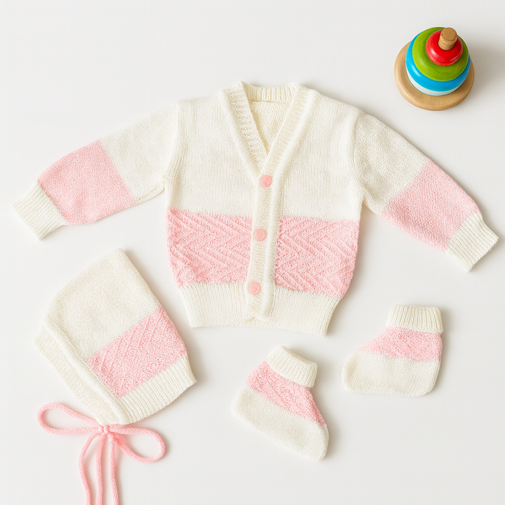 Keep your little one cozy and stylish with this 3-piece White & Pink Baby Woolen Set. Made from premium quality wool, this set includes a buttoned cardigan, matching bonnet cap, and warm socks. The soft knitted fabric ensures comfort and breathability, while the pastel pink accents add a charming touch. Ideal for newborns and infants, this set makes a perfect winter essential or a thoughtful baby shower gift.