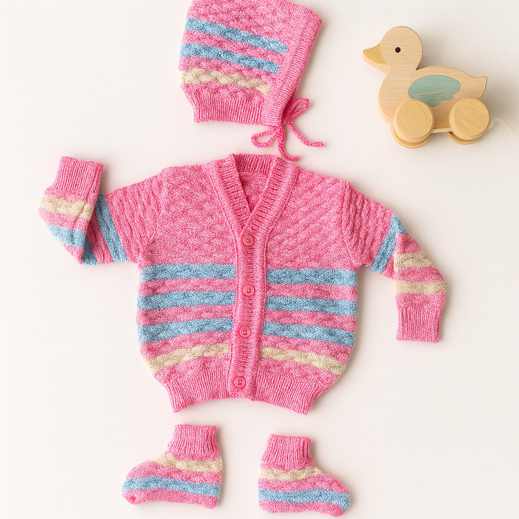 This charming pink baby knit set is designed with colorful rainbow stripes in pastel blue, yellow, and pink for a cheerful look.
